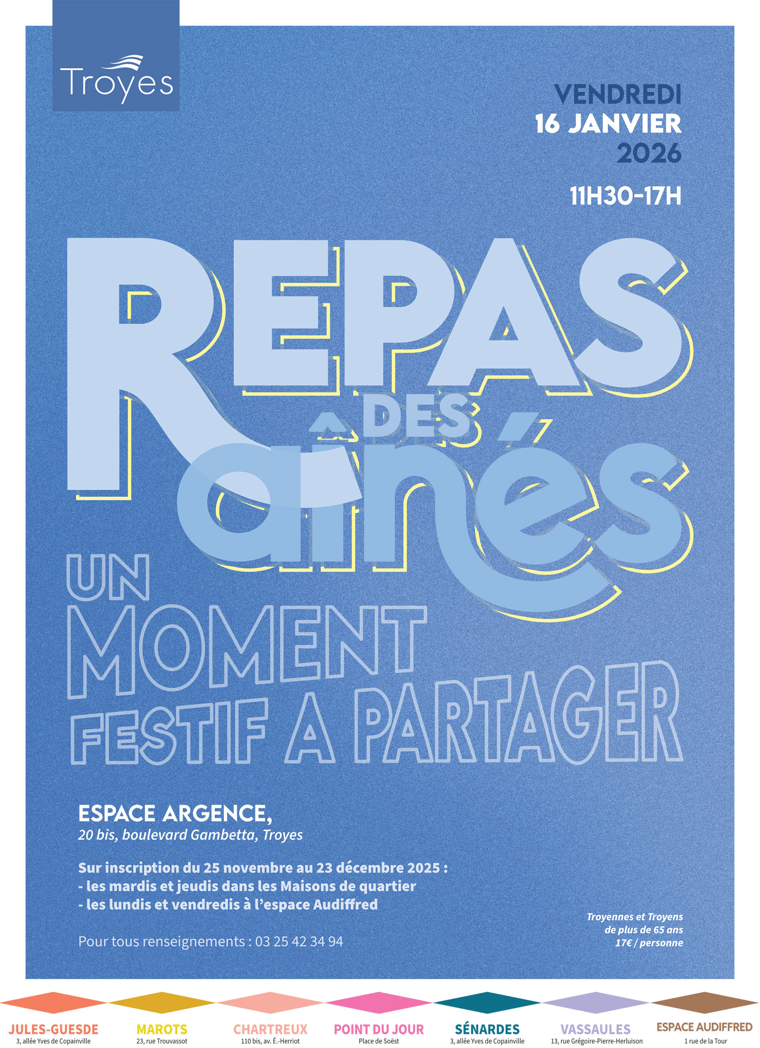 La Ville de Troyes organise un Repas des Aînés, le vendredi 16 janvier 2026 de 11h30 à 17h , pour les Troyennes et Troyens âgés de 65 ans et plus. Ce moment convivial se déroulera à l'Espace Argence, autour d'un repas festif et d'une animation dansante.